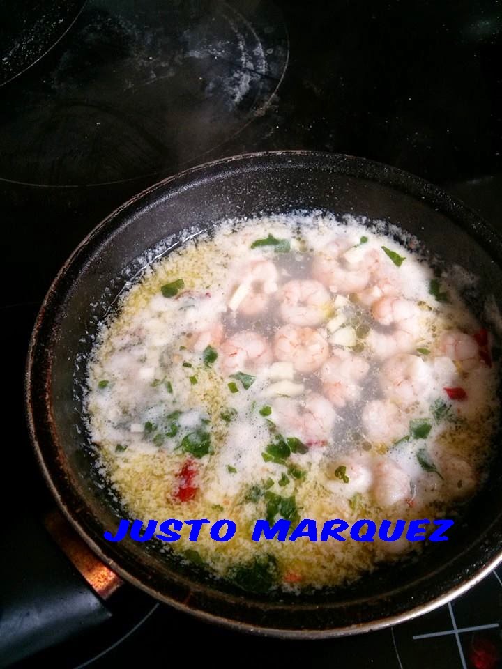 pasado este tiempo le añadimos las gambas peladas, para que se rehogue con el